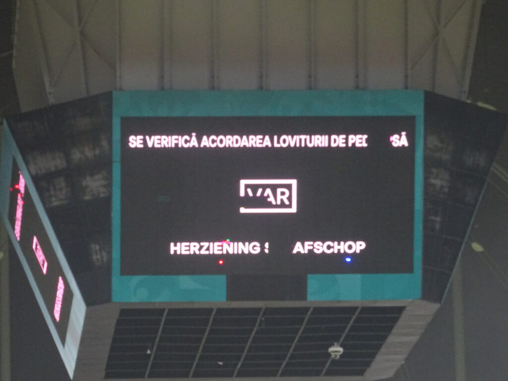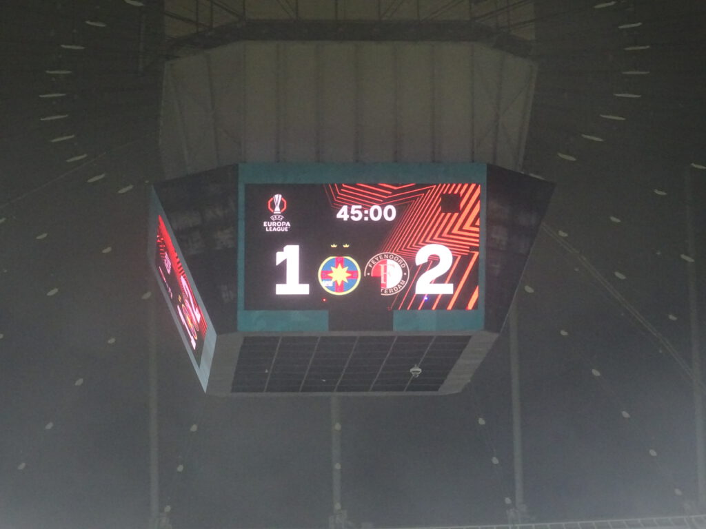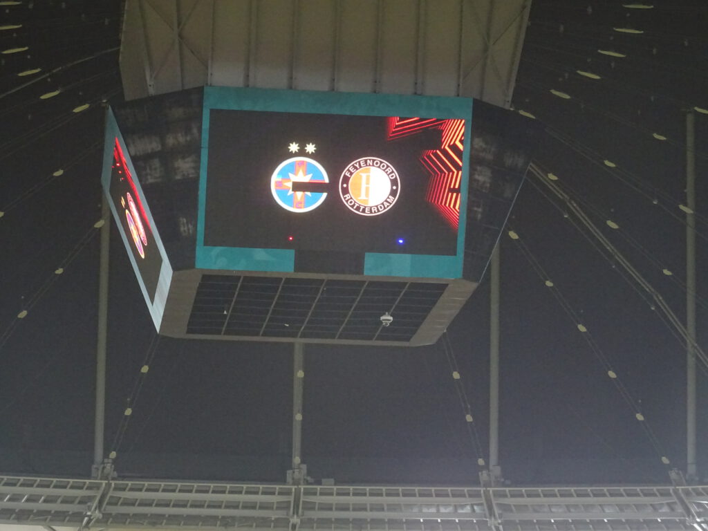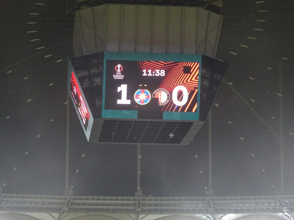 Door dat kapotte LED-scherm lijkt het FCSB logo net een pacman die Feyenoord gaat opeten. Hahaha, die gasten gaan natuurlijk nooit van ons winnen…