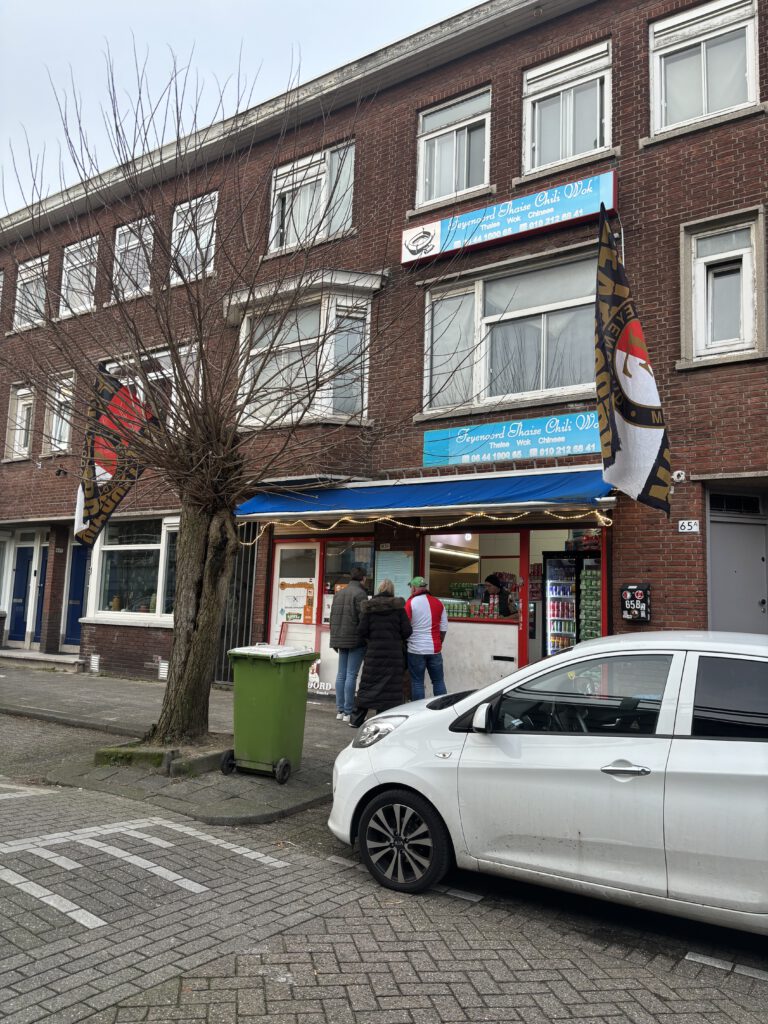 Lopend richting het stadionviaduct kwam ik weer lang de Feyenoord Thaise Chili Wok. Een zaak waar blikken bier hoog opgestapeld lagen. Wachtend op dorstige kameraden. Om klandizie te trekken zong de eigenaar fonetisch de Feyenoord-klassiekers uit zijn geluidsinstallatie mee. Aan alles merkte je dat dit een bijzondere avond kon gaan worden.